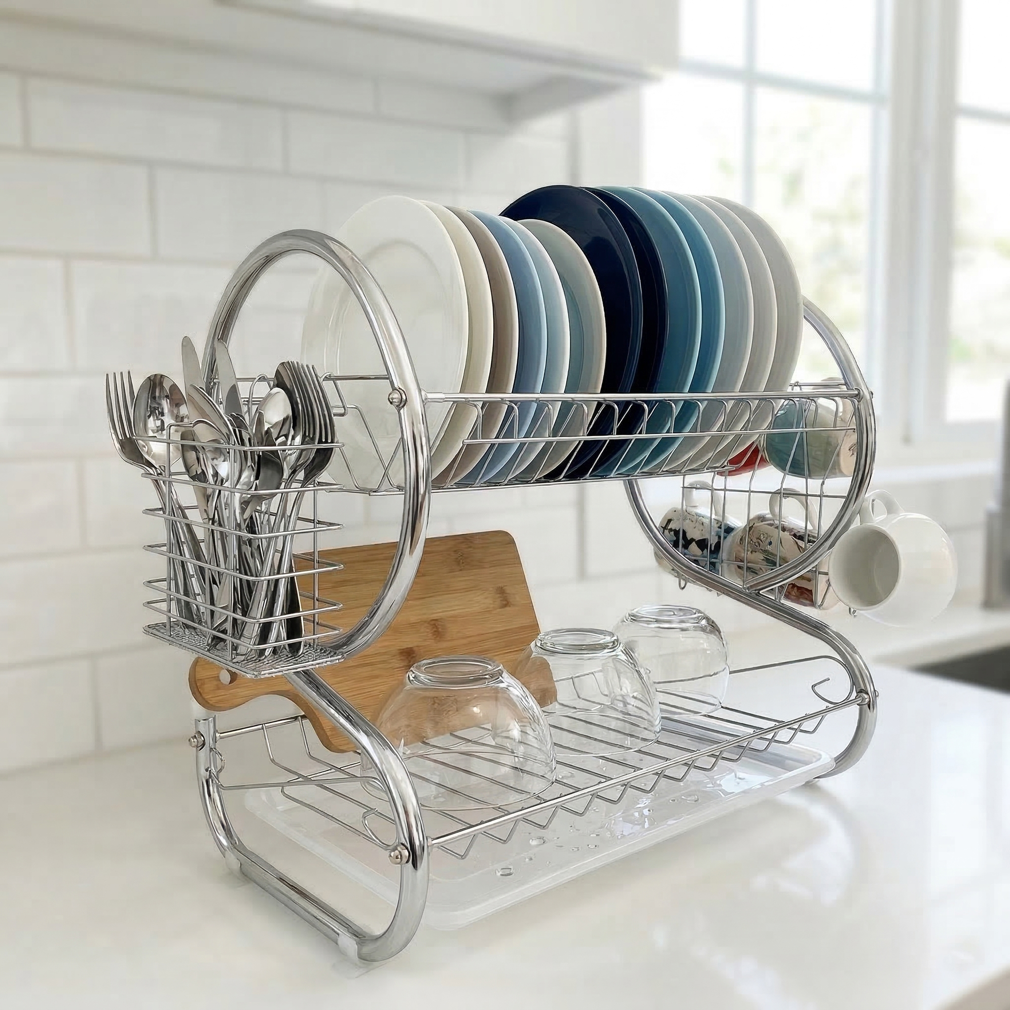 O Escorredor de Louças 2 Andares Cromado é a solução completa para secar e organizar pratos, copos, talheres e tábuas de corte em um único lugar. Design compacto em formato de "S" que aproveita o espaço vertical da bancada.