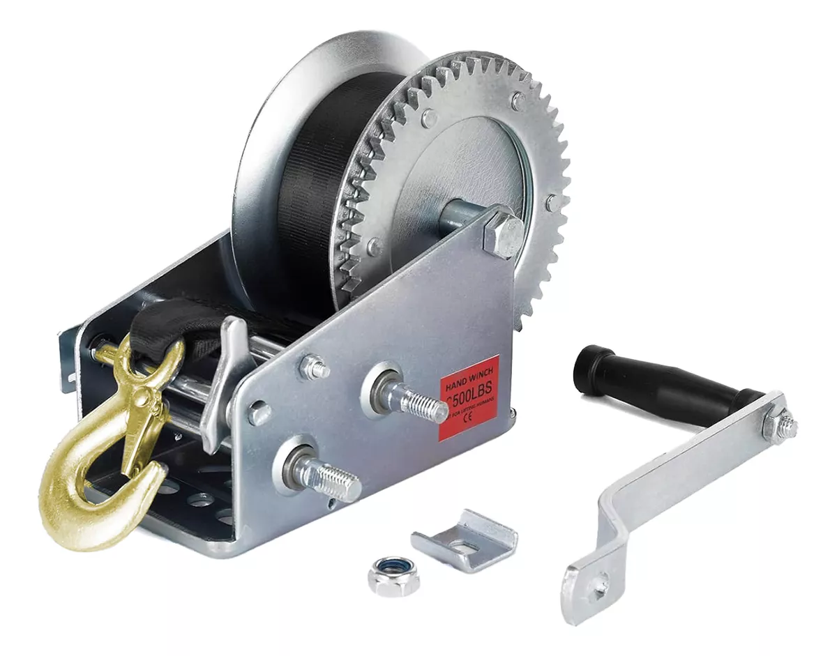 A cinta em nylon acompanha gancho. Este guincho possui duas opções de taxa de tracionamento: 4.1:1 ou 8:1 que multiplicam a força de quem está manuseando o equipamento.