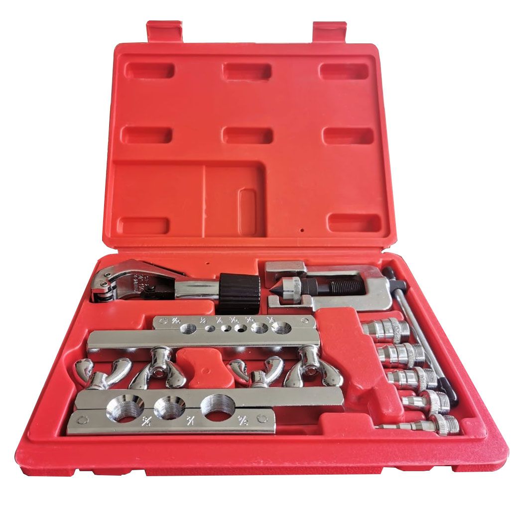 O kit flangeador para tubos é indicado para tubos de cobre, alumínio e plástico, a ferramenta é utilizada para encanamentos de refrigeração, aquecimento etc.