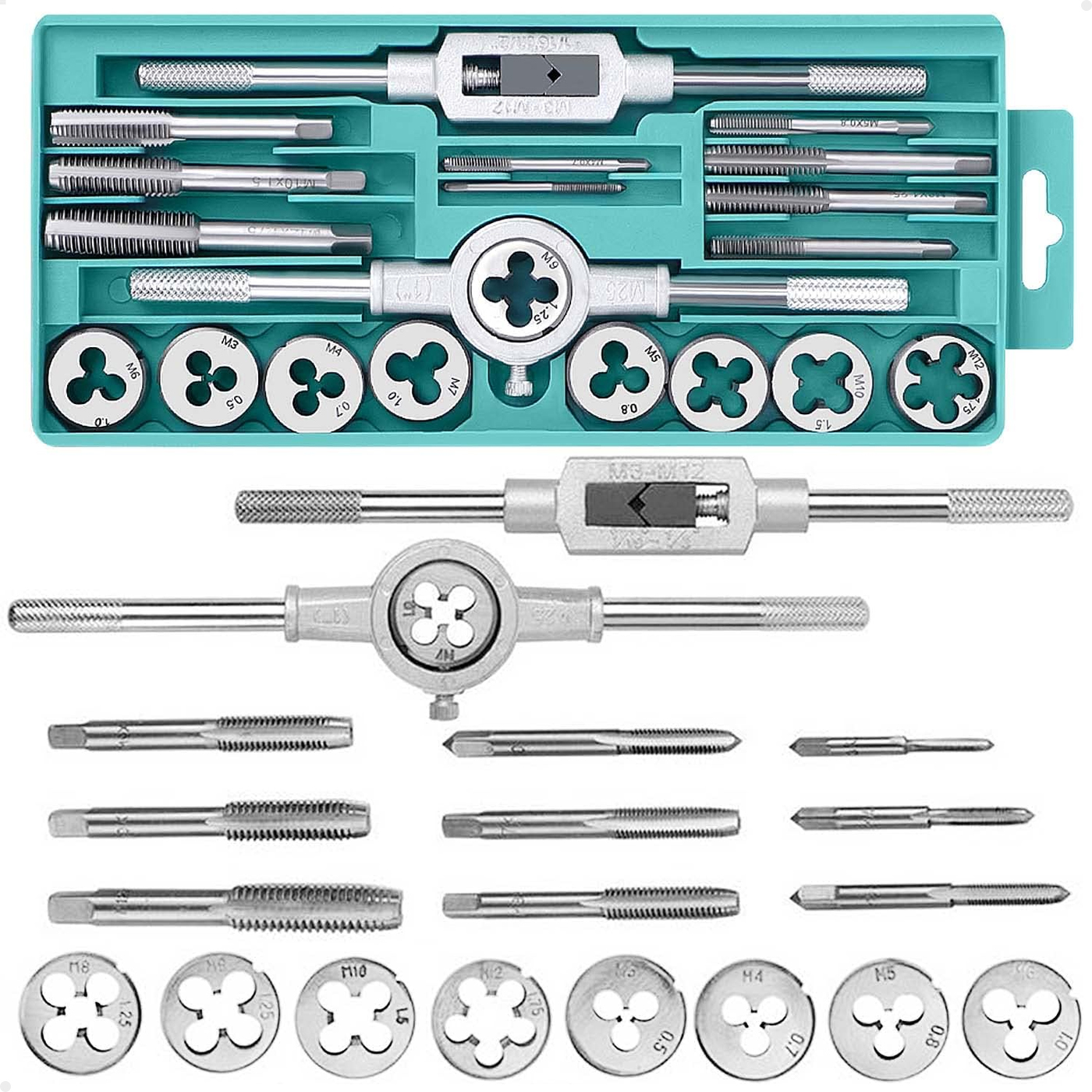 Machos e tarraxas: 3mm x 0,5mm, 4mm x 0,7mm, 5mm x 0,8mm, 6mm x 1,0mm, 7mm x 1,0mm, 8mm x 1,25mm, 9mm x 1,25mm, 10mm x 1,5mm, 12mm x 1,75mm